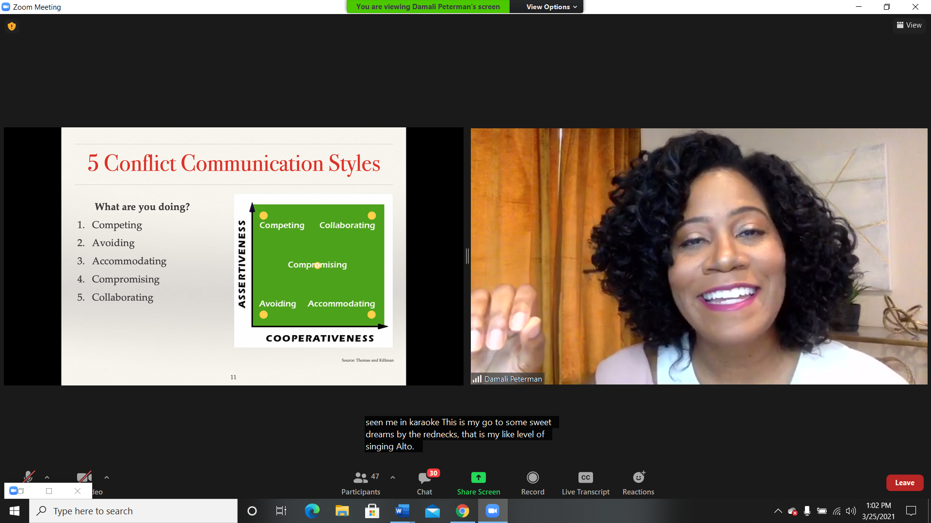 Among other frameworks for understanding and preventing conflict, Damali reviewed the Thomas-Kilmann Conflict Mode Instrument’s communication styles and how they might appear in common workplace situations. Understanding those styles, Damali said, can help in understanding behavior even if we do not know people well, as can happen in remote work relationships. That understanding can also help us be aware of our own responses to conflict, avoiding defensiveness and adapting our response to the situation constructively.